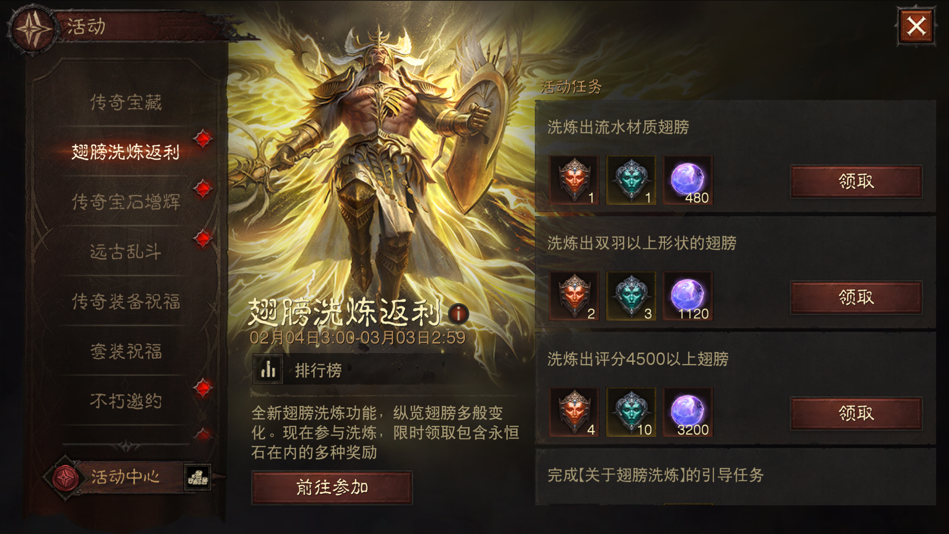 前往威斯特玛,完成洗炼引导查看洗炼翅膀的权益和排行榜功能洗炼出特定材质、形状和评分的翅膀