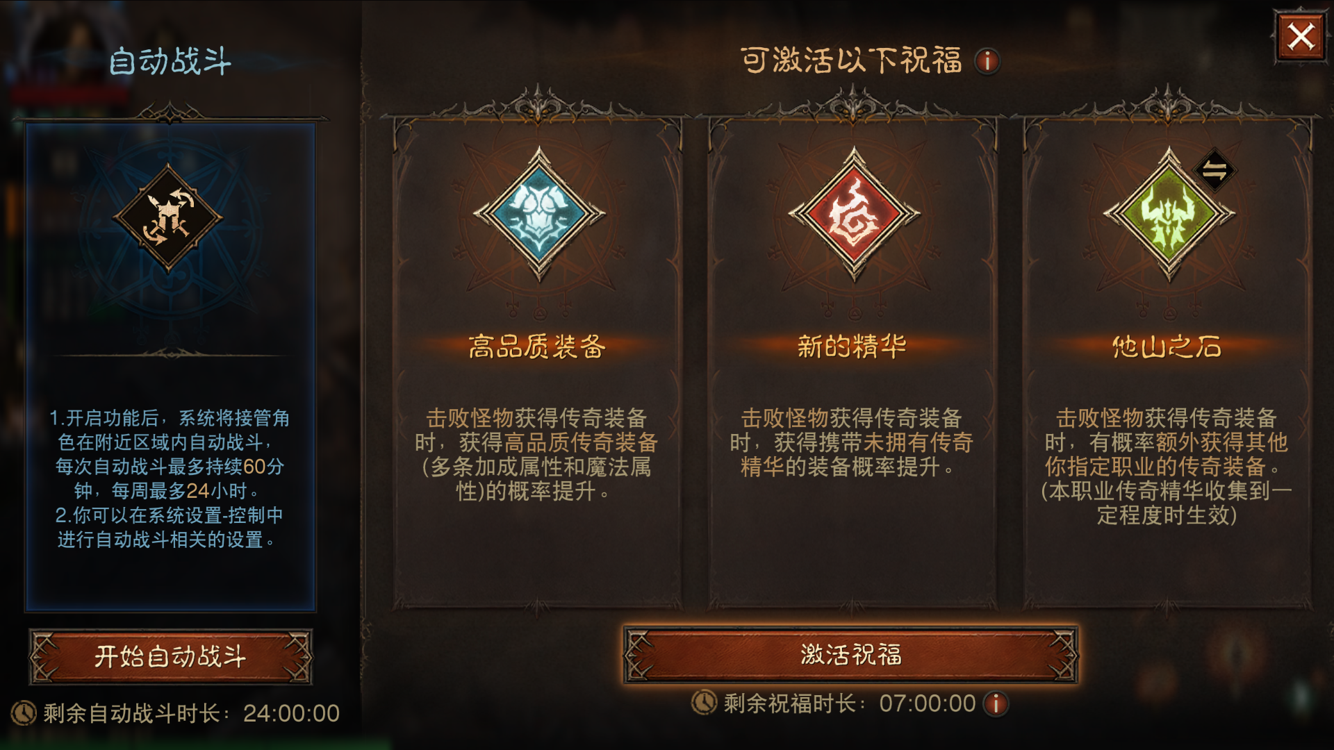 今天刷野时,也别忘了在自动战斗界面激活“传奇装备祝福”,提升高品质橙装、未拥有精华,以及指定其他职业的传奇装备掉落。希望你的野外刷怪收获满满!
